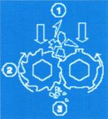 兩個反向旋轉(zhuǎn)的軸致使顆粒物在雙軸間被粉碎;